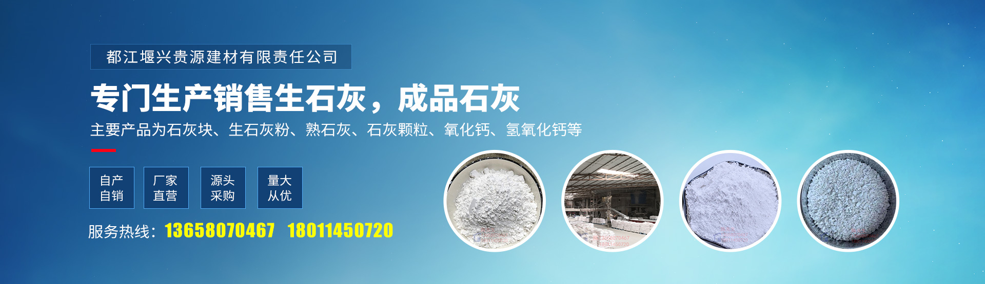 都江堰興貴源建材有限責(zé)任公司是一家以專門生產(chǎn)銷售生石灰,成品石灰的公司,擁有豐富的石灰石資源。工廠面積十余畝,在都江堰、峨眉均有產(chǎn)品供應(yīng)基地。 主要產(chǎn)品為石灰塊、生石灰粉、熟...
